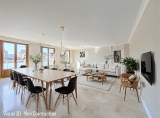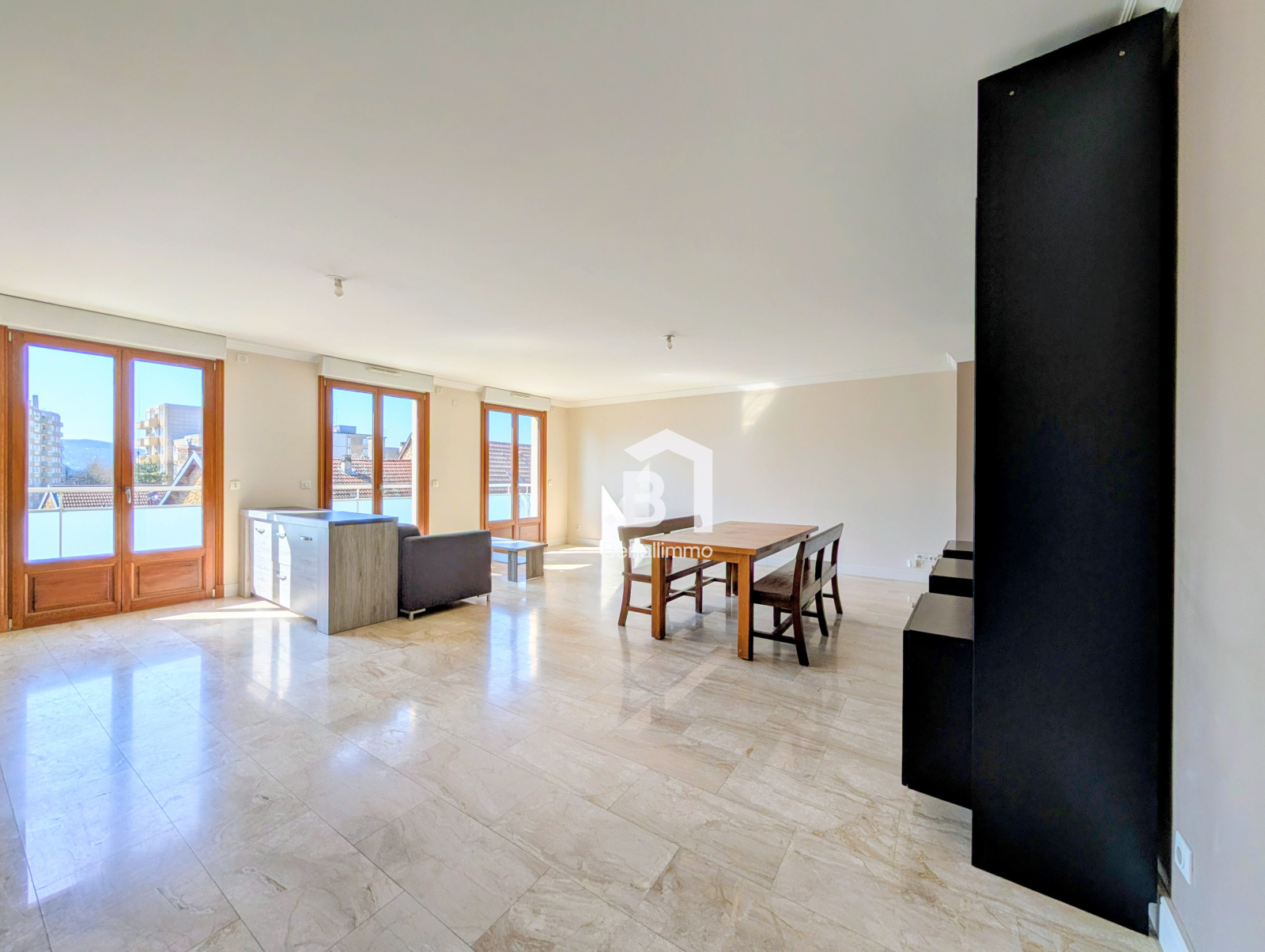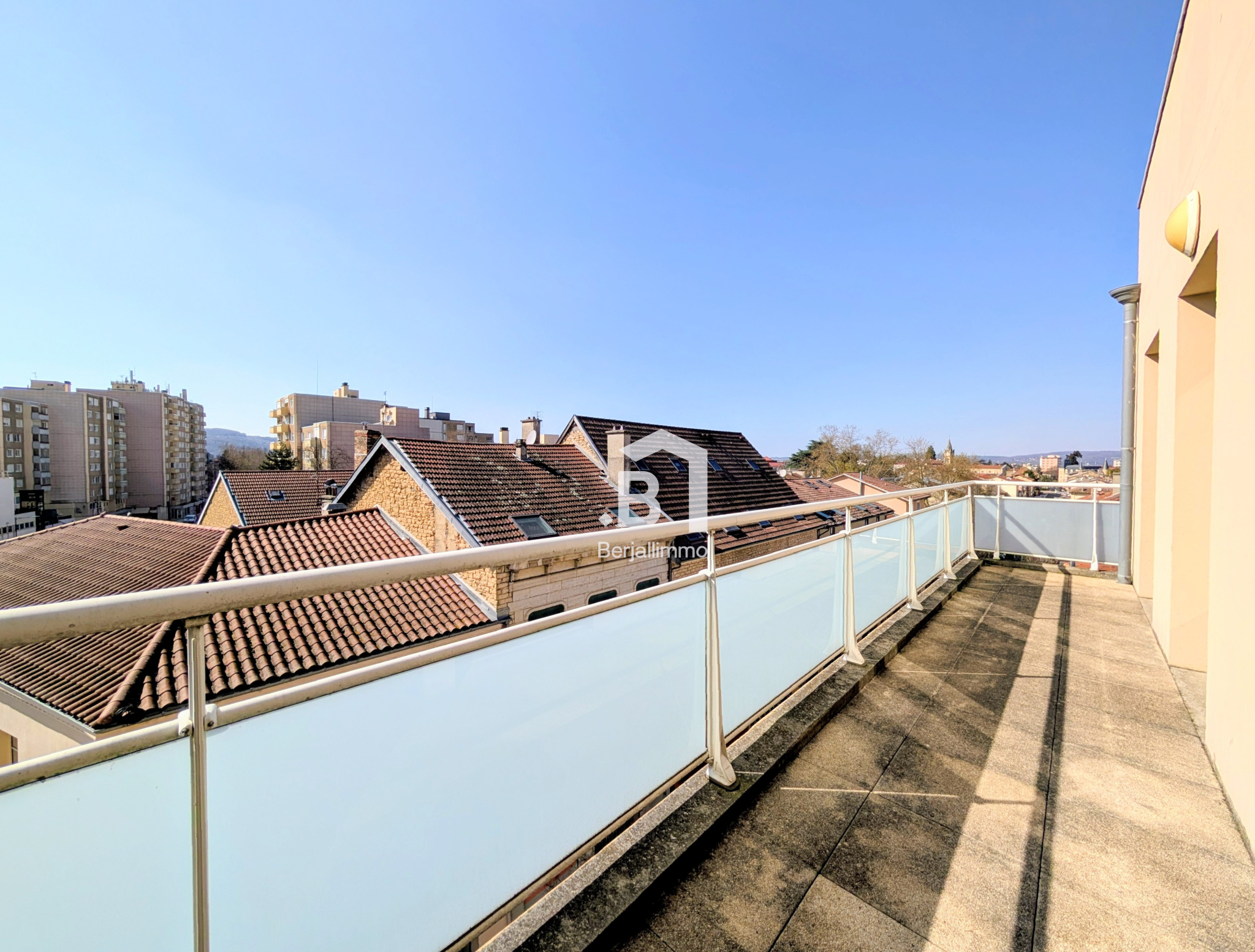 La pièce de vie, spacieuse et baignée de lumière avec ses 47 m², constitue un véritable coup de cœur. Ses trois portes-fenêtres ouvrent sur une agréable terrasse de 12 m², offrant une vue dégagée sur les toits — un cadre idéal pour vos moments de détente.