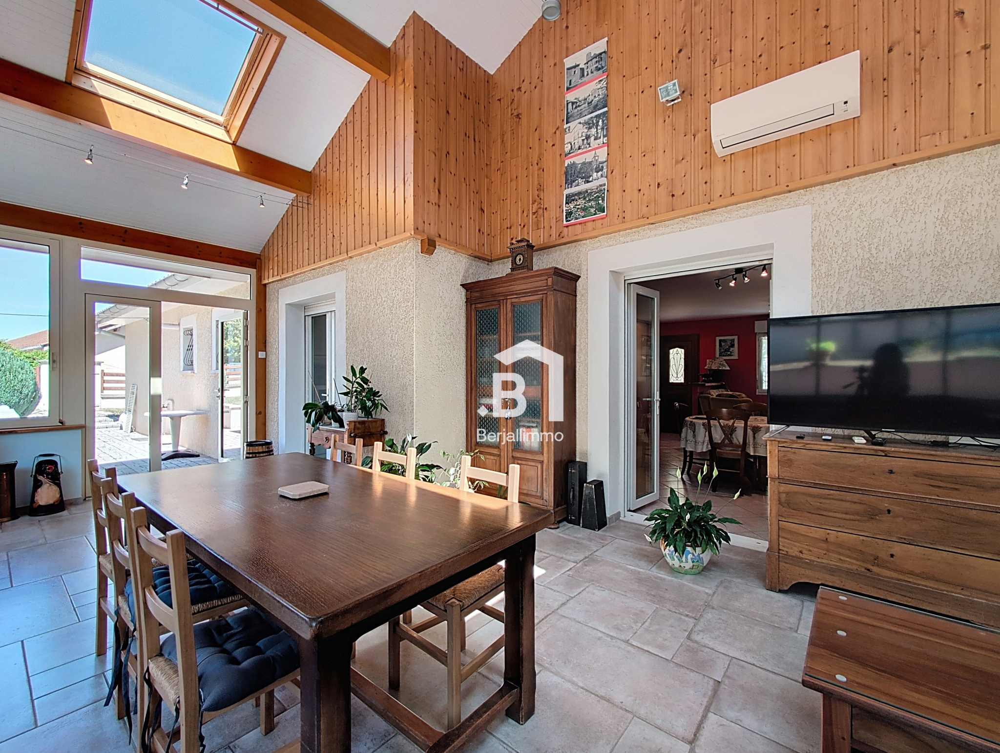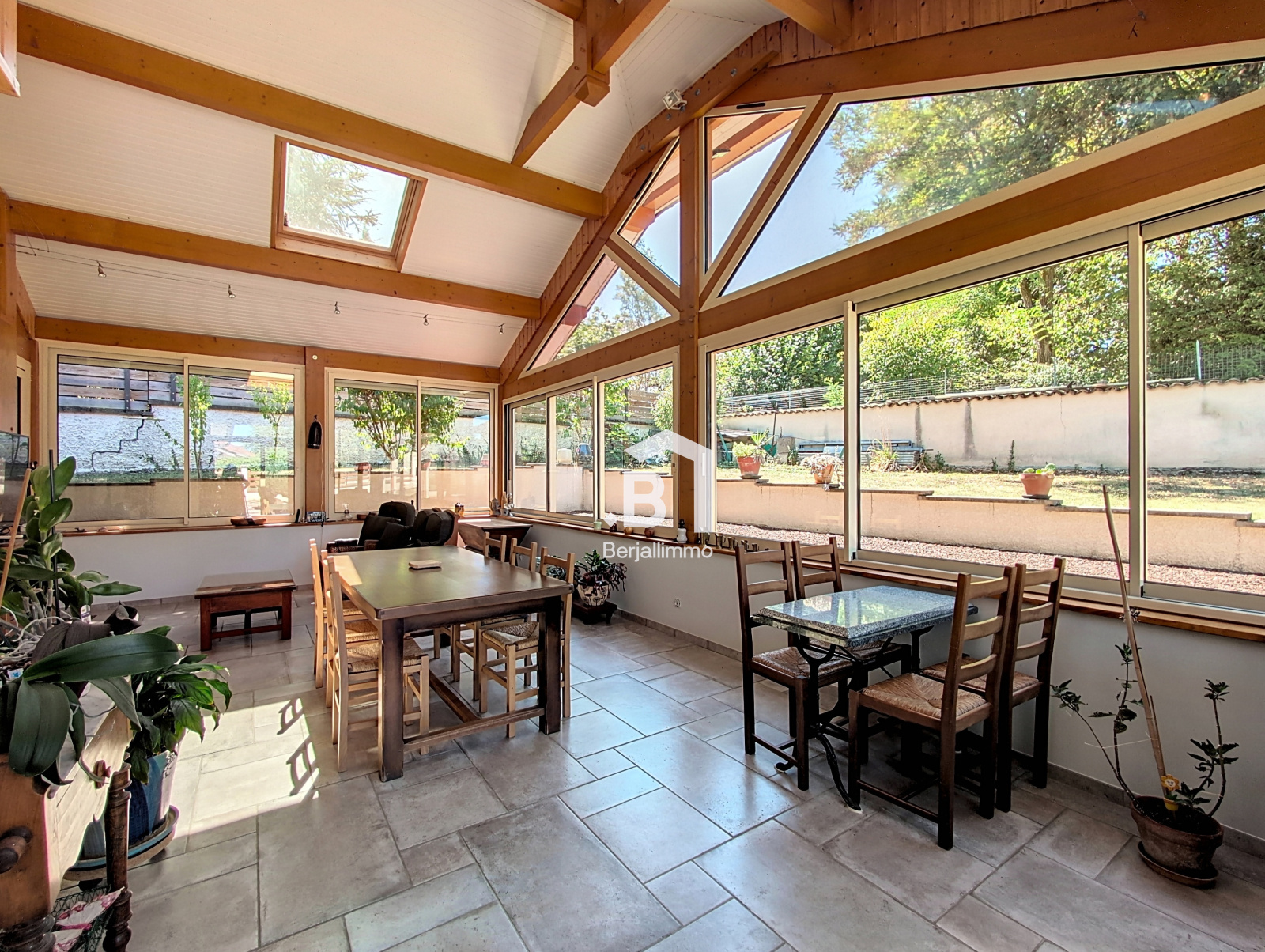 Elle offre une pièce de vie spacieuse de 36 m² avec cuisine ouverte équipée, donnant accès à une superbe véranda chauffée de 34 m², idéale en toute saison.