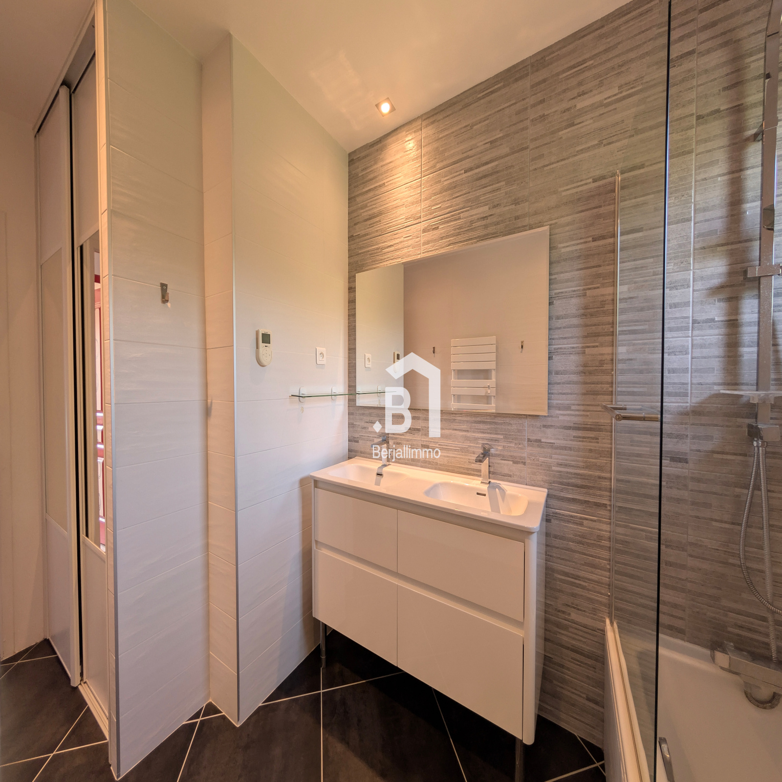 - 1 salle de bains moderne avec baignoire et son meuble double vasque,