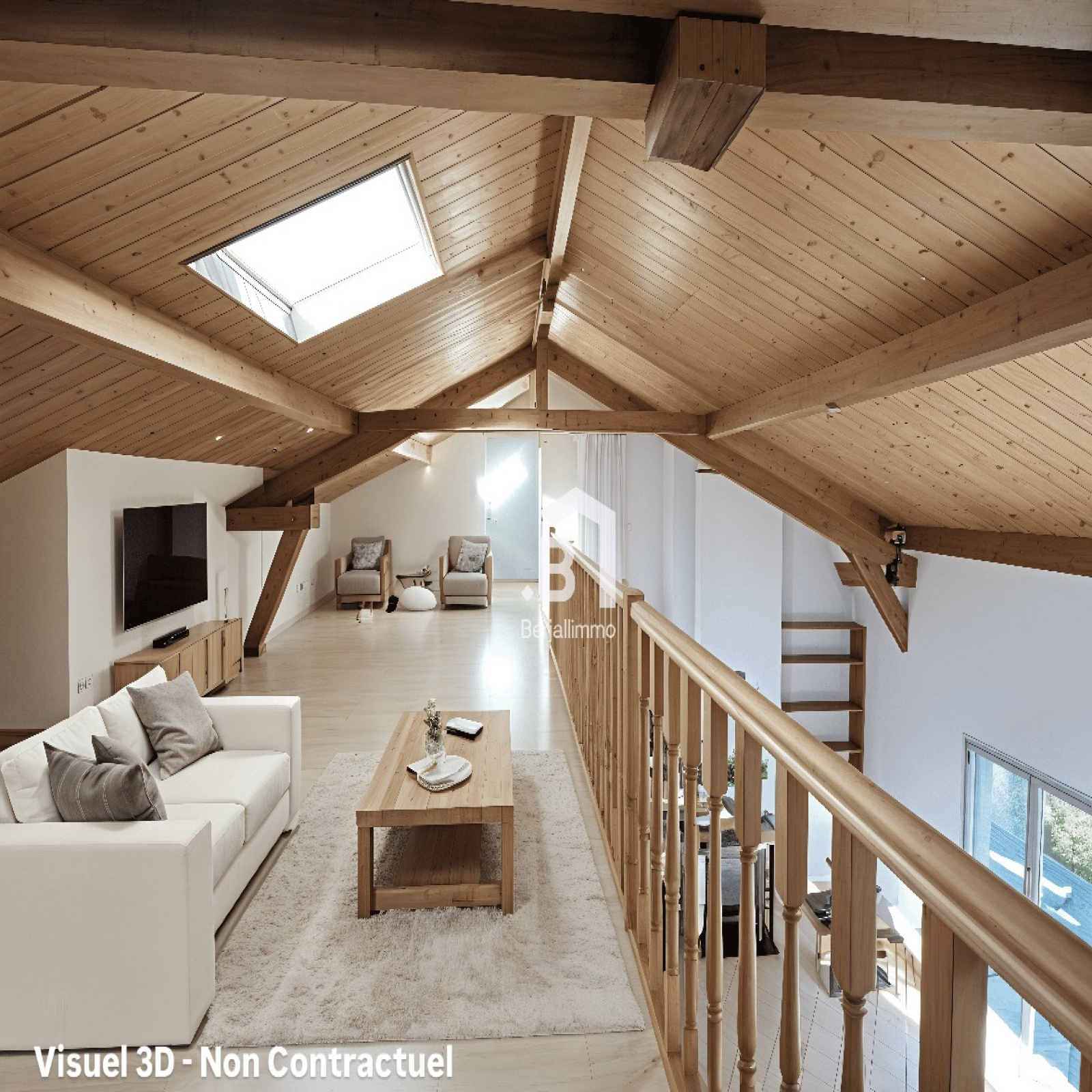A l’étage, une grande mezzanine de 30 m² offre un espace modulable (salle TV, bureau, salle de jeux), complétée par une chambre et une salle d’eau.