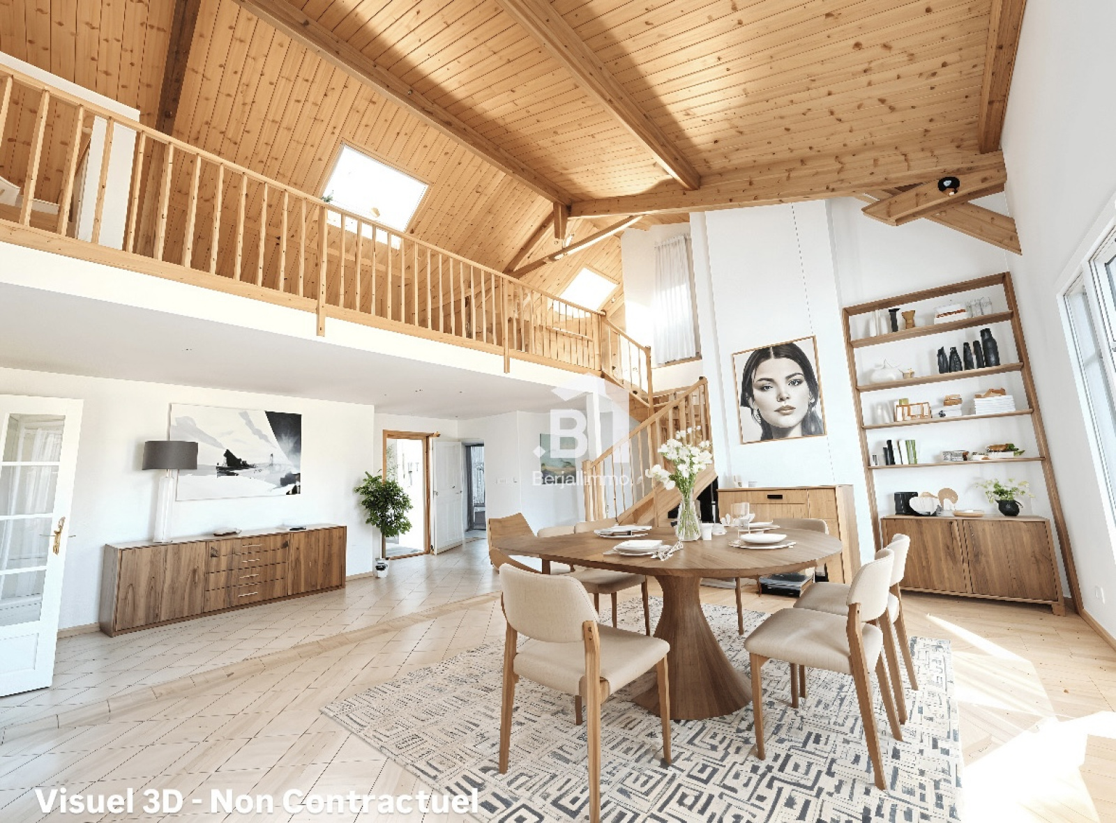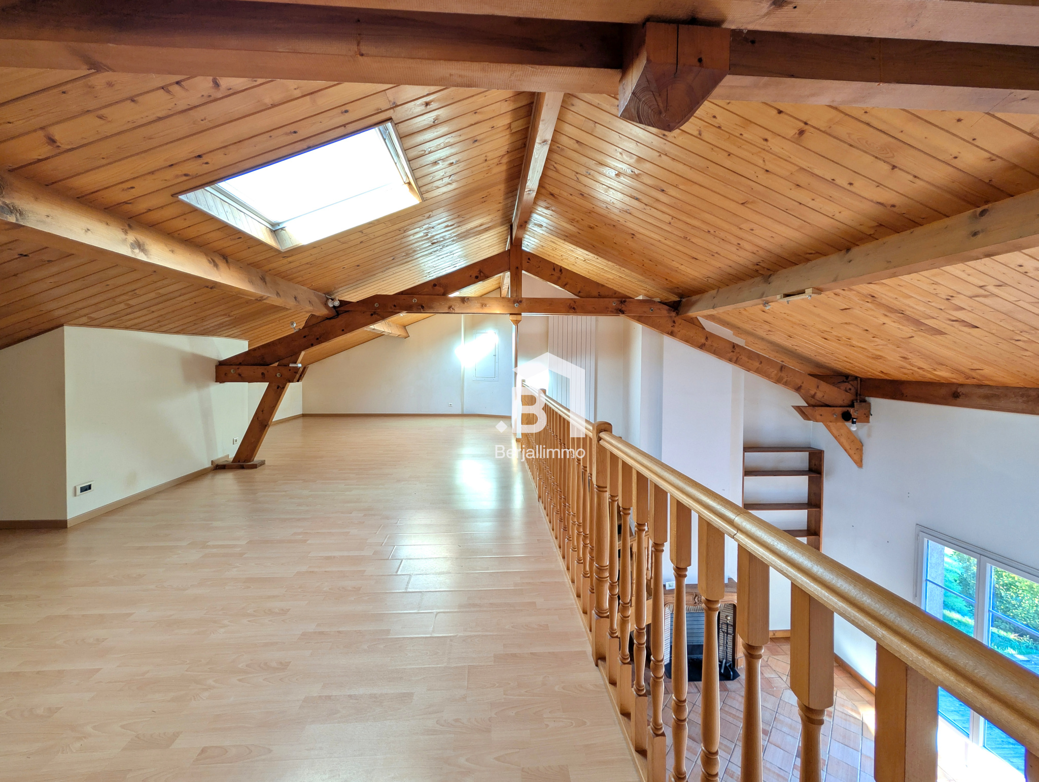 A l’étage, une grande mezzanine de 30 m² offre un espace modulable (salle TV, bureau, salle de jeux), complétée par une chambre et une salle d’eau.